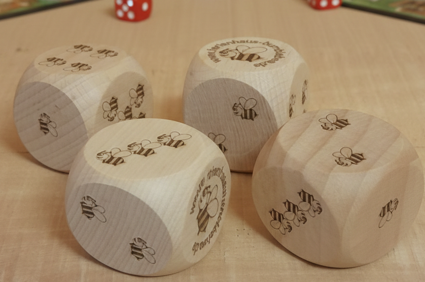Ob als individuelles Maskottchen für Ihr Unternehmen (wie unser Beispiel „Ferienhaus Bumblebee“), als kreatives Give-away oder als besonderes Element in Ihrem Brettspiel – dieser Würfel verbindet Natur mit moderner Personalisierung.