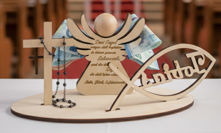Suchen Sie nach einer stilvollen und persönlichen Art, Geld oder Gutscheine zur Kommunion zu verschenken? Dieser handgefertigte Schutzengel aus hochwertigem Holz ist nicht nur eine praktische Verpackung, sondern ein bleibendes Erinnerungsstück an diesen besonderen Tag.