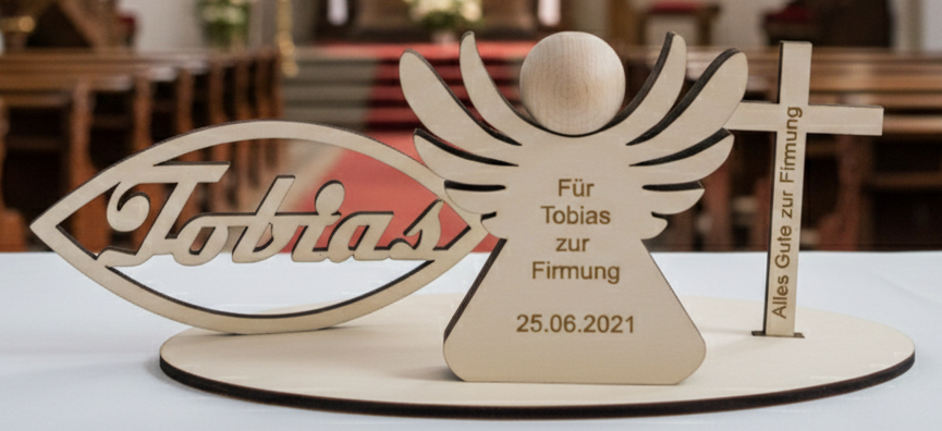 - Inbegriffen: Der personalisierte Holzengel, das Namens-Fisch-Symbol und die Bodenplatte (fertig montiert).