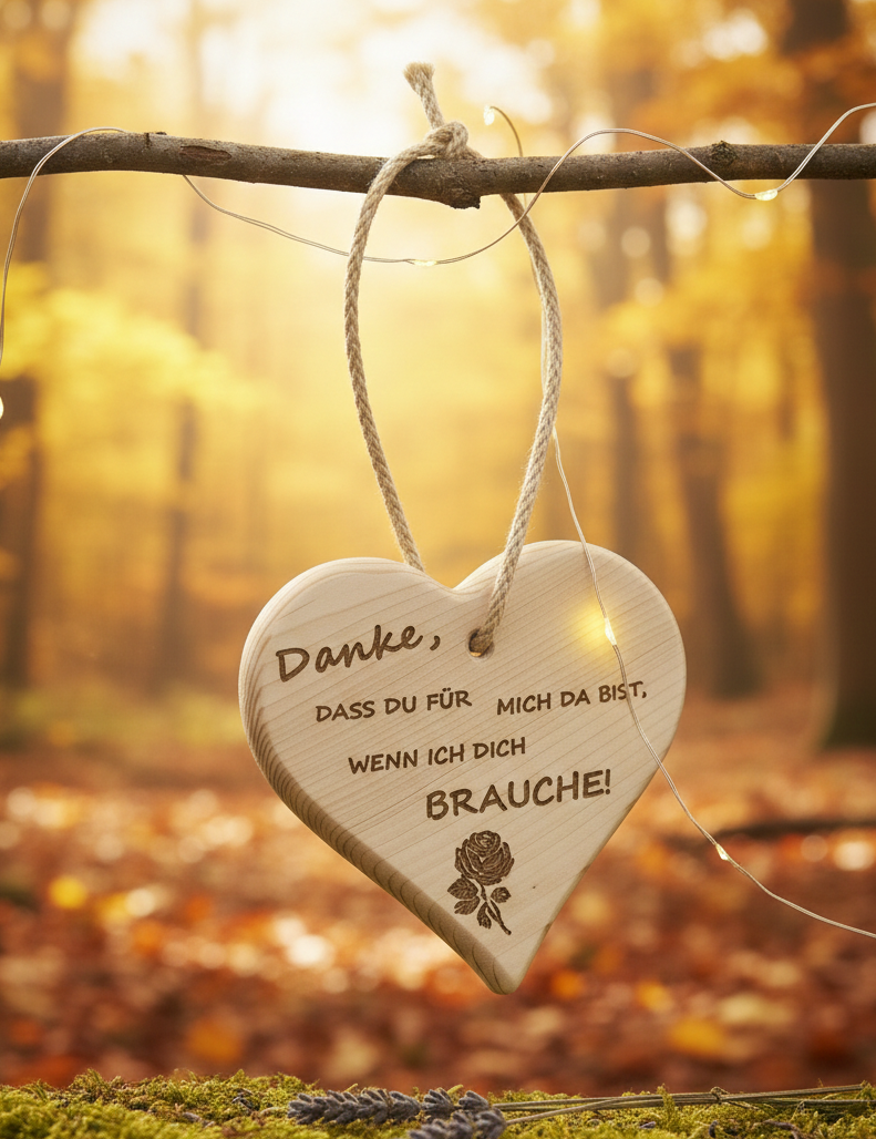 Bringe Wärme und Liebe in dein Zuhause oder verschenke ein Unikat, das bleibt. Unsere handgefertigten Herzen aus echtem Fichtenholz bestechen durch ihre rustikale Eleganz und eine tiefenwirksame, dunkle Lasergravur.
