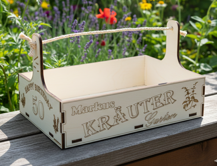 Holen Sie sich die Natur direkt auf den Tisch! Unsere liebevoll gestaltete Kräuterkiste aus hochwertigem Holz ist nicht nur ein praktischer Organizer, sondern ein echtes Unikat. Ob für die Fensterbank, den Balkon oder die Terrasse – mit der individuellen Namensgravur wird dieses Set zum absoluten Highlight.